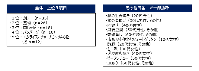 また、上位に挙がった項目以外にも、性別・年代別問わず、様々な料理名が回答された。