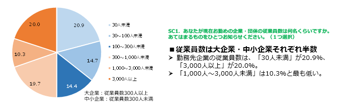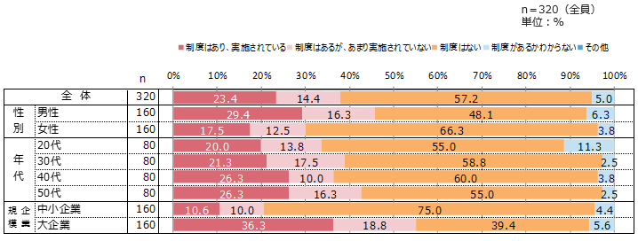 ・企業規模別でみると、「制度はあり、実施されている」は大企業が中小企業の約3倍となっている。