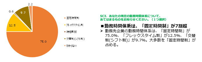 | 調査項目 | ・勤続年数(SA)/賃金体系(SA)/勤怠管理方法(SA) ・「ノー残業デー」の制度の有無(SA) ・小池都知事の「超過勤務縮減策」に関する意見(SA) ・1ヶ月の平均残業時間(SA)/自身の残業時間に対する意識(SA) ・過去1年間の休日出勤の有無(SA) ・代替・振替休日取得状況(SA) ・年次有給休暇取得状況(SA) ・「仕事とプライベート」重視度(SA) |
