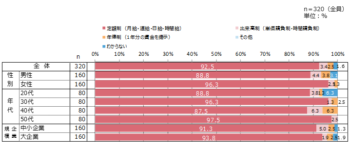 ・企業規模別でみると、大企業・中小企業どちらも「定額制」が9割を超えているが、中小企業は「出来高制」の割合がやや高い。