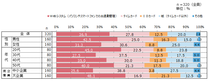 ・性別でみると、「Webシステム」「IDカード」は男性の方が女性より高いが、「タイムカード」「紙」は女性の方が男性より高い。