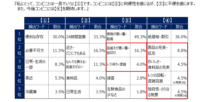 まずはじめに、「コンビニに対する意識、考え」を文章完成法で確認。利用者の多くは、「24時間営業している事」に利便性を感じており、「便利」「身近な」存在と捉えている。その他にも「どこにでもある」「品揃えがよい」などにも利便性を感じている一方、利用する人が多いコンビニでは、「価格」「品切れ」「レジの混雑」などについて、不便さを感じている。今後期待されている事は、価格を除いては、「品揃えの充実」「おいしさ・食料品の充実」「レジの回転・混雑回避」「独自性・さらなる発展」などがあがる。