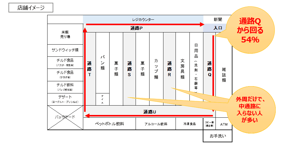 コンビニの入り口からどのようにお店を回るか確認したところ、最も多いのは入り口からすぐ横の雑誌コーナーを通る回答が5割以上であった。