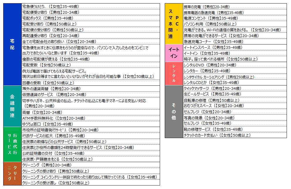 今後、コンビニにあったら良いと思う商品・サービスについて聴いてみたところ、商品では「食品関連」が多くあがり、その中でも「生鮮食品」「健康・カロリーオフ食品」などの意見が目立った。サービスでは「宅配」に関する意見が目立ち、近年の物流に対する問題への意識や、普段自宅にいない時に受け取れないという悩みを解消したいという気持ちがみられる。その他、利用できる時間帯が限られているため、仕事をしていると利用しにくい「行政サービス」や「クリーニング」などを求める声もあがった。