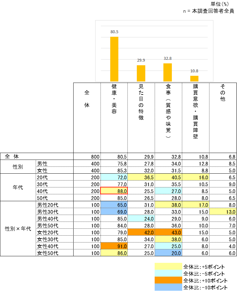 全体で次いで多かった理由は「食事(質感・味覚)」で40.6%だった。50代に着目すると、「見た目の特徴」(44.2%)や「食事(質感・味覚)」(53.3%)が他年代と比べて高い結果となった。