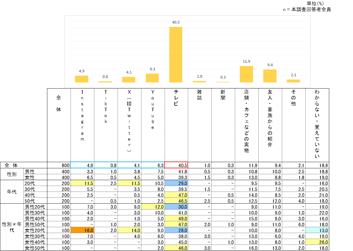 アサイーを初めて知った媒体として最も多かったのはテレビで、4割を超える結果となった。一方、SNS全体(Instagram、TikTok、YouTube、X)は16.1%にとどまり、50代を除いて、年代が上がるにつれて割合が低下する傾向が男女ともに見られた。SNSの内訳では、Instagram、TikTok、YouTube、Xの順に多かった。また、店舗・カフェでの体験や友人・家族からの紹介といった接点も、合わせて約2割を占めた。
