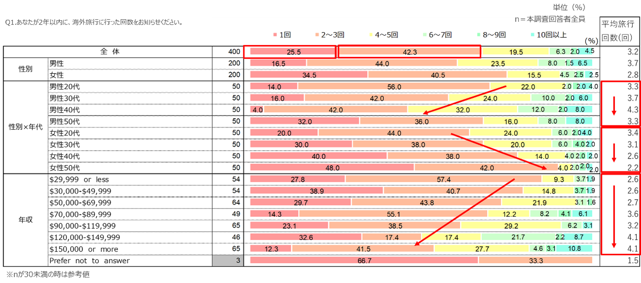 男女で見ると、男性は年齢が上がるほど海外旅行の回数が多くなる傾向にあるが、女性は年齢が上がると旅行回数がやや少なくなるなど、男女間で異なる傾向が存在するようだ。