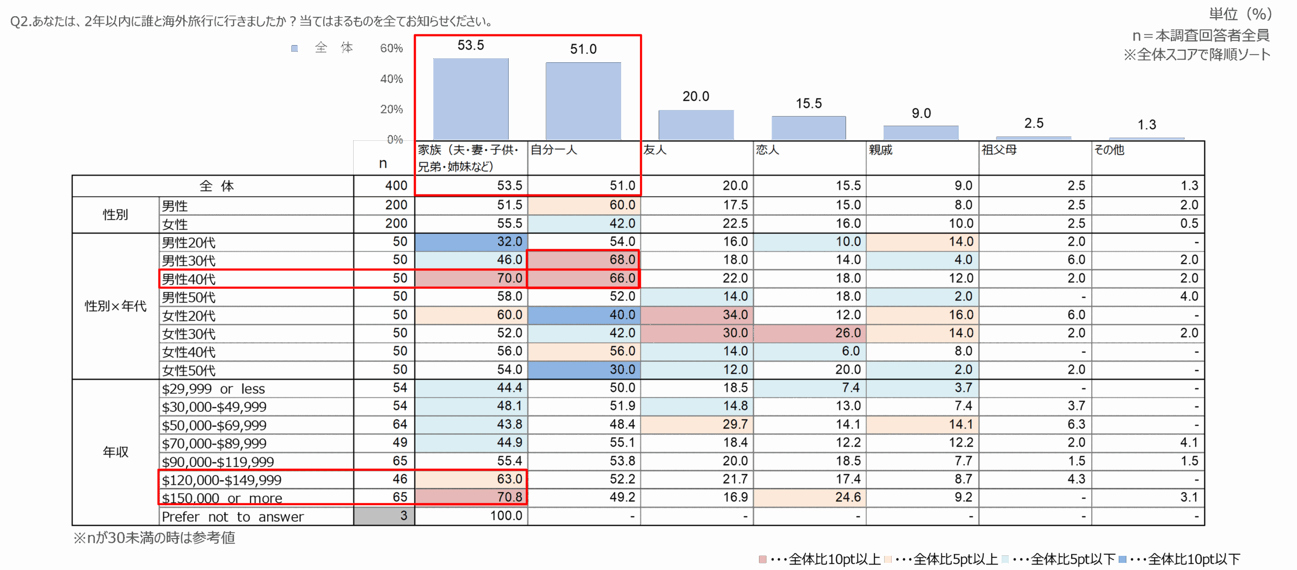 「家族」での海外旅行は男性40代が最も多く、年収が高いほど「家族」で海外旅行に行く傾向がある。