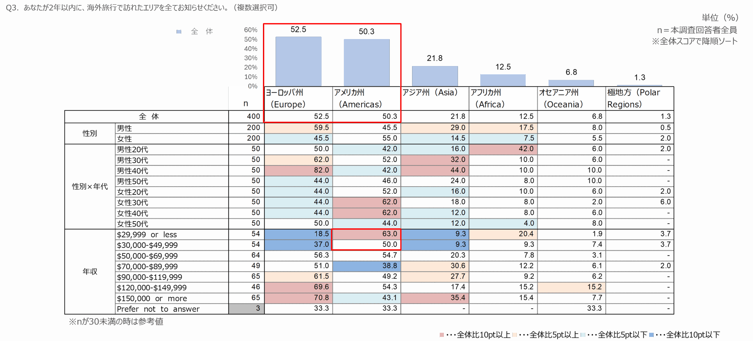 年収50,000ドル未満の層は「アメリカ州」が支持を得ており、地理的に訪問しやすいことや短期旅行などで比較的安価に海外旅行を楽しめることが一因と考えられる。