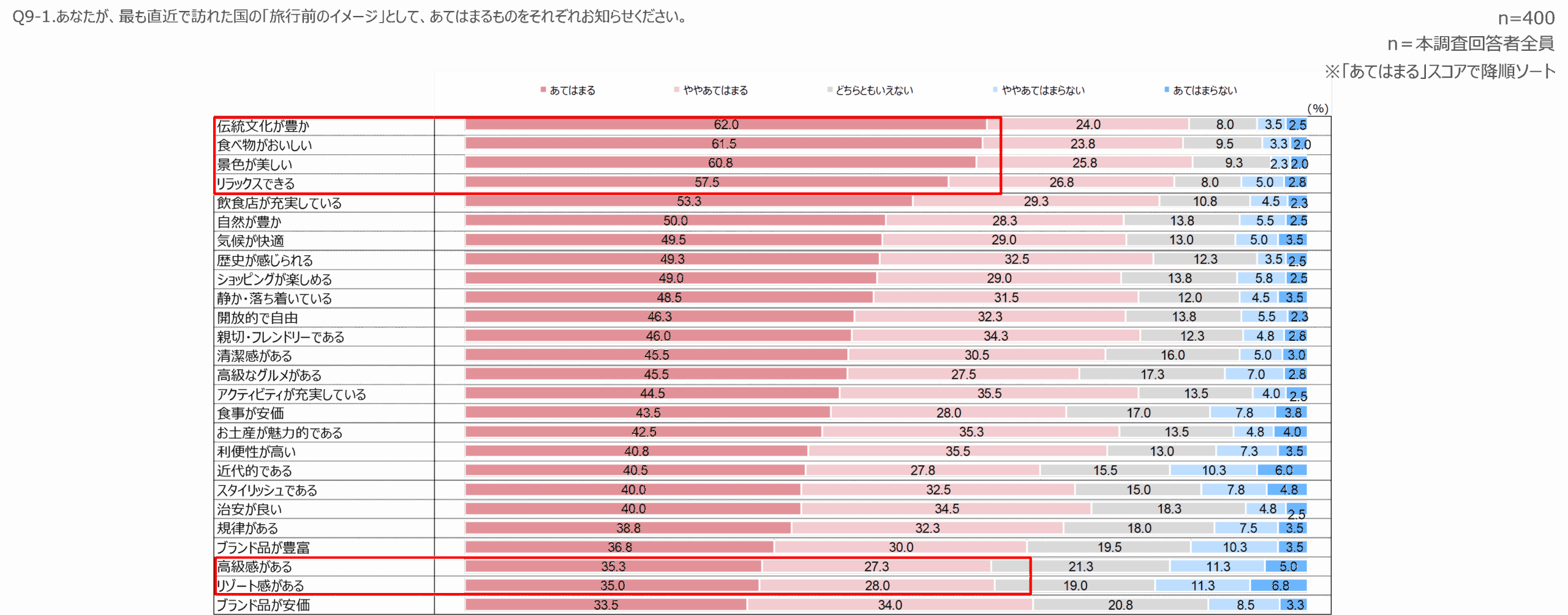 旅行前の印象は「伝統文化が豊か」「食べ物がおいしい」「景色が美しい」「リラックスできる」が高評価を得ており、伝統文化や自然美、食文化を楽しめる旅行先への期待が読み取れる。「高級感」「リゾート感」を求めて旅行先を選んだ層は比較的少数派である。