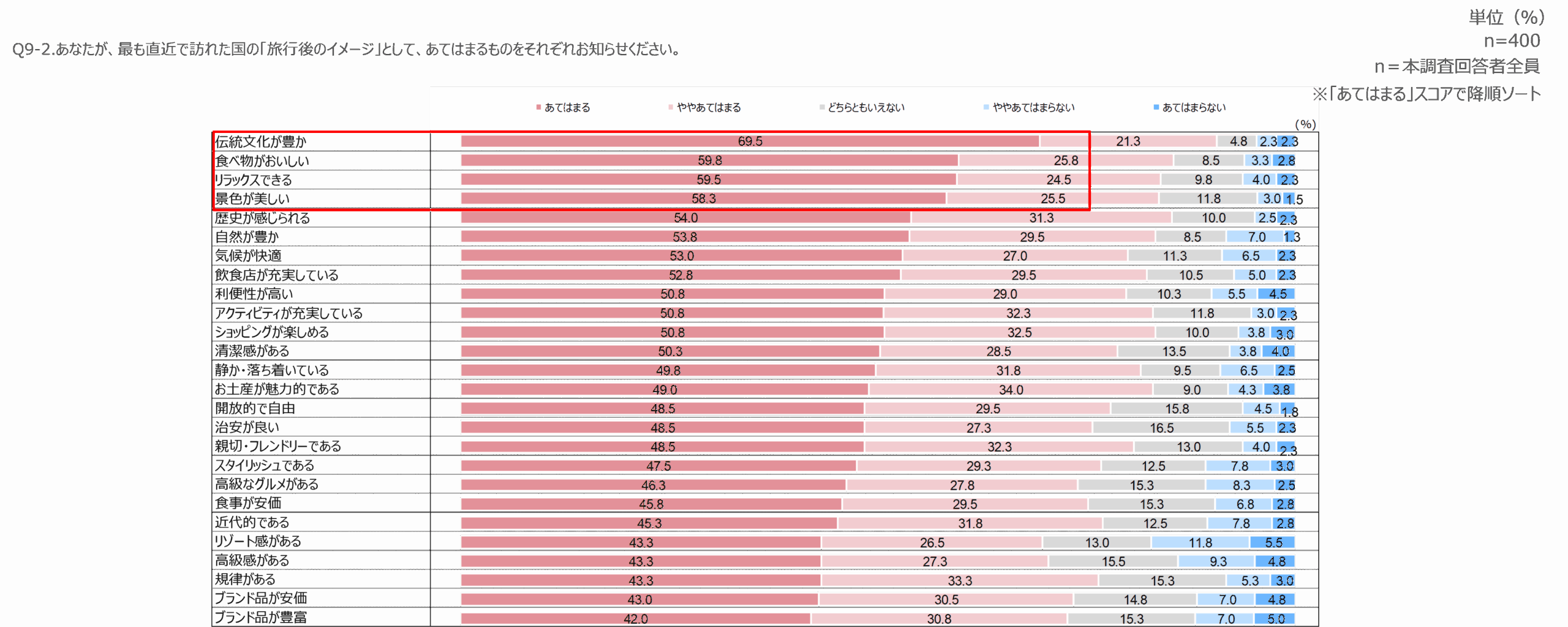 旅行後の印象は「伝統文化が豊か」は最も高いスコアを示しており、訪問前に抱いていた印象と一致した可能性がある。他にも「食べ物がおいしい」「リラックスできる」「景色が美しい」が旅行前の印象と同じく評価が高い。おおむね訪問前の期待に沿った結果であると考えられる。