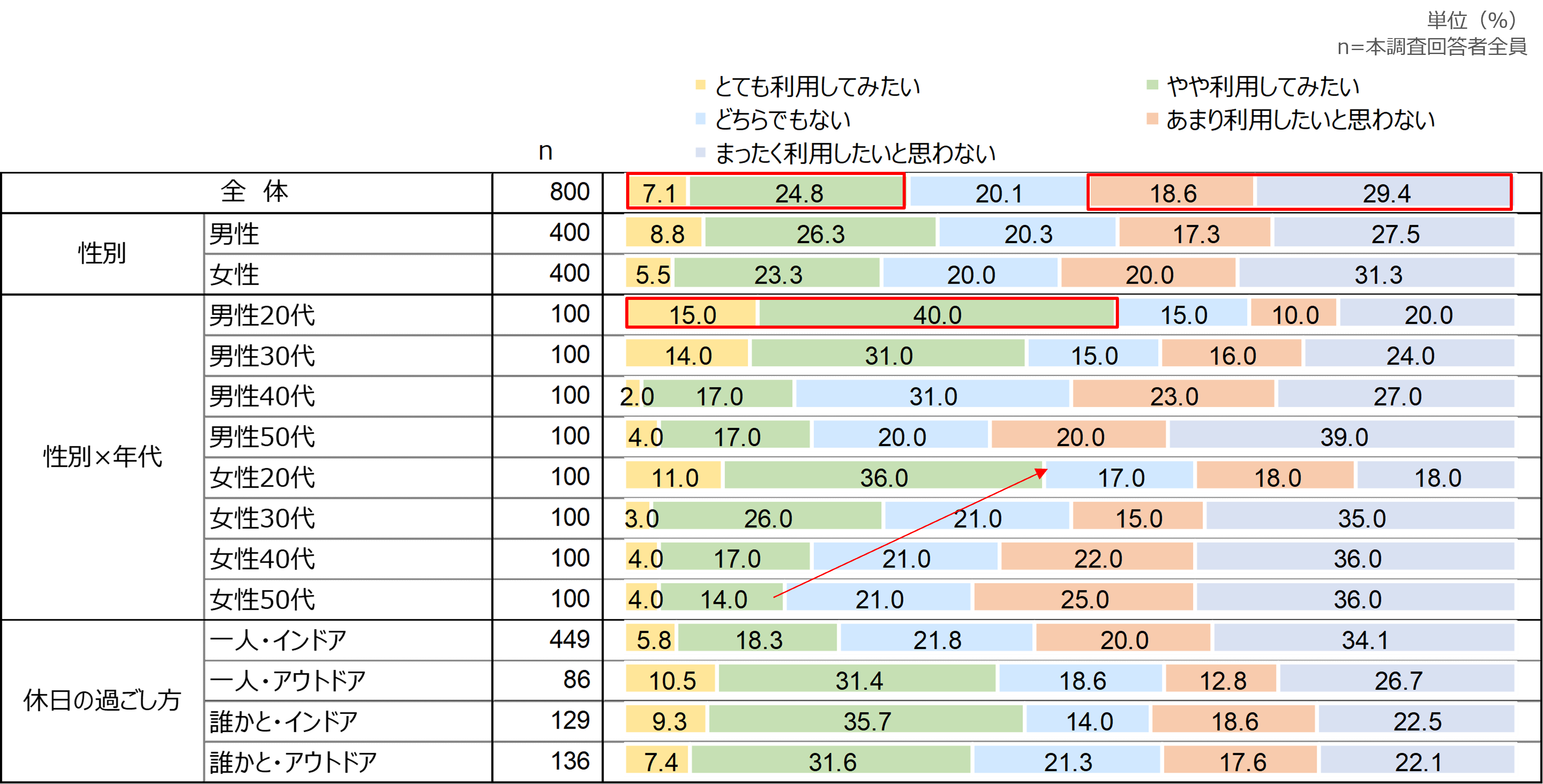 全体では、3割強が利用してみたい(とても利用してみたい+やや利用してみたい)と回答。性別×年代でみると、男性20代の5割半ばは利用してみたいと回答。