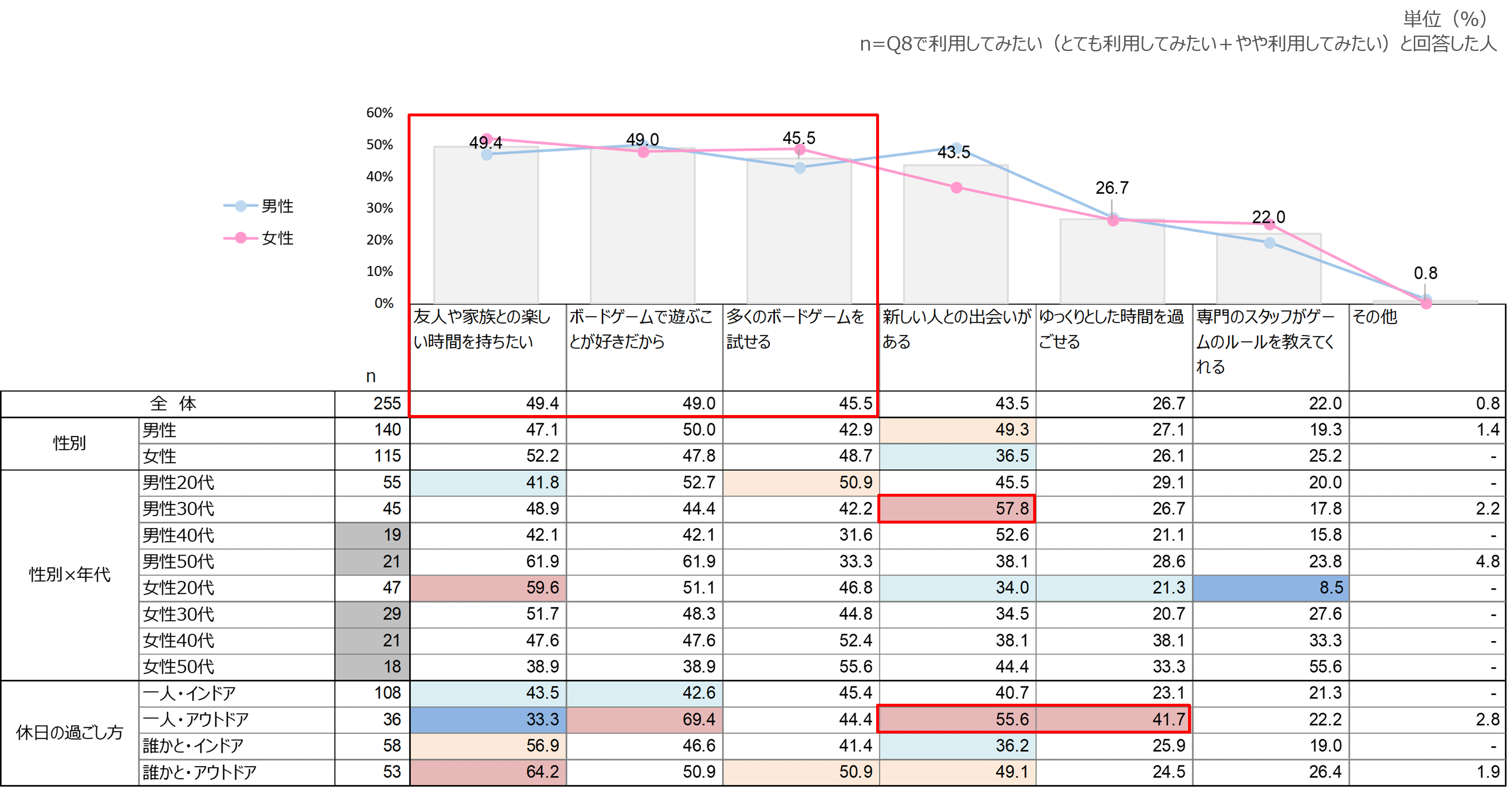 全体では、「友人や家族との楽しい時間を持ちたい」が5割弱と最も高く、次いで「ボードゲームで遊ぶことが好きだから」、「多くのボードゲームを試せる」と続く。性別×年代でみると、男性30代の6割は「新しい人との出会いがある」と回答。