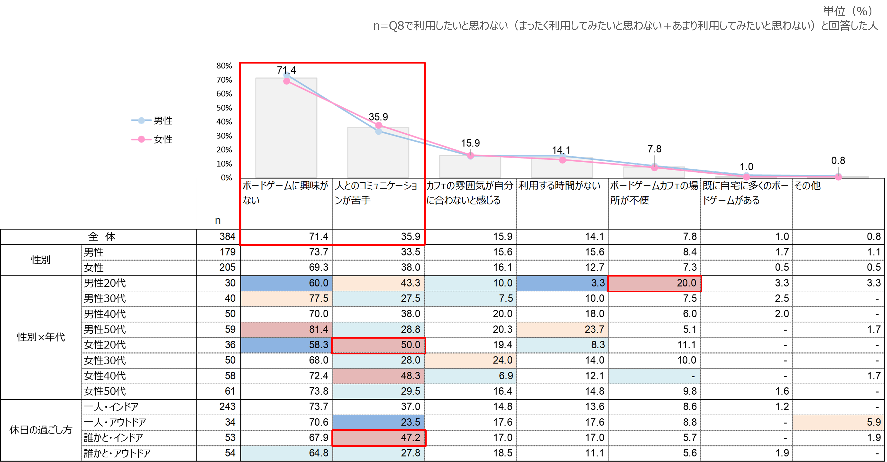 男性20代の5割半ばはボードゲームカフェを利用してみたいと回答した一方、女性20代の5割が非利用意向の理由として「人とのコミュニケーションが苦手」と回答