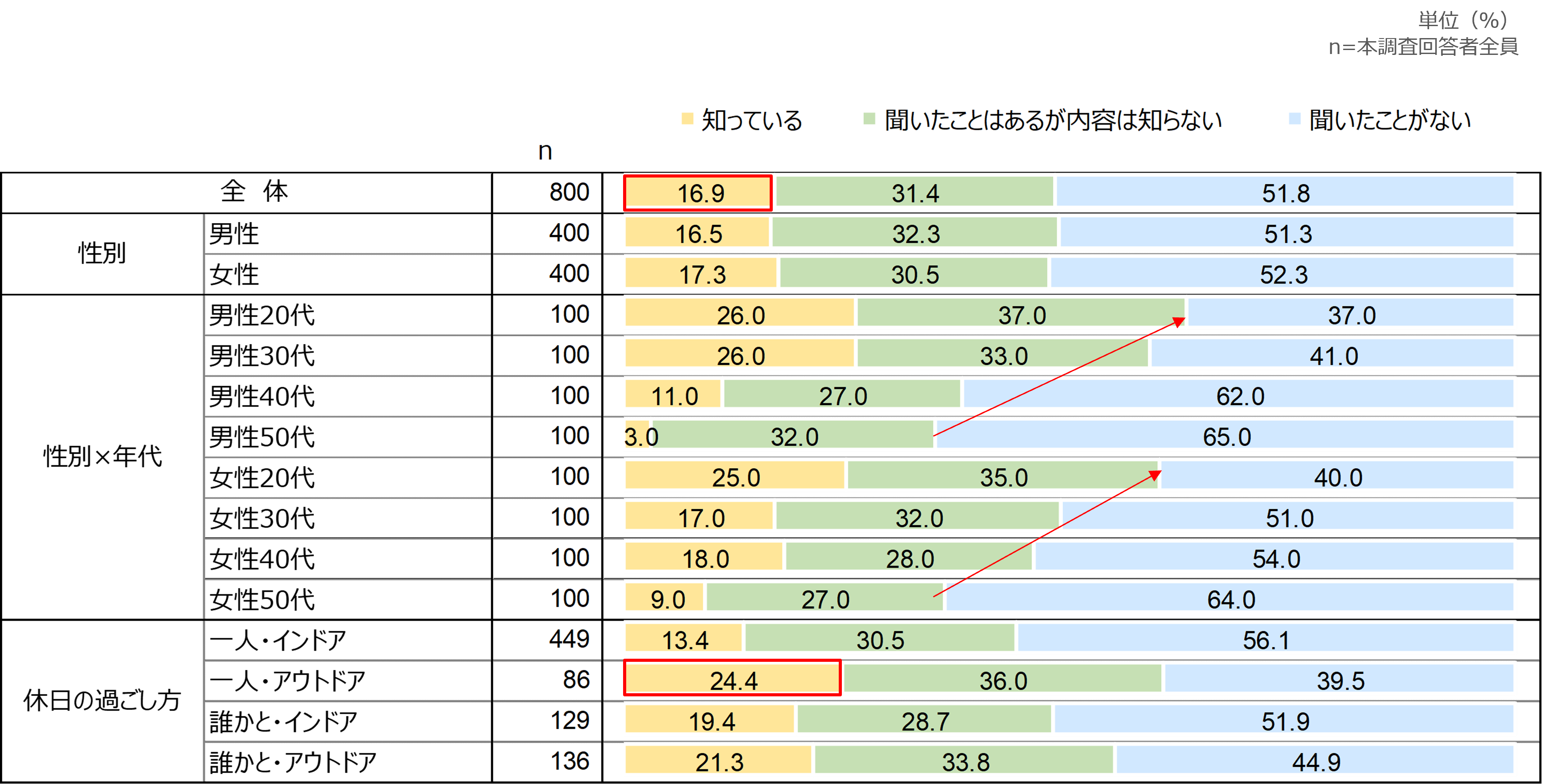 全体では、2割弱が知っていると回答。休日の過ごし方でみると、一人・アウトドアは2割半ばが知っていると回答。