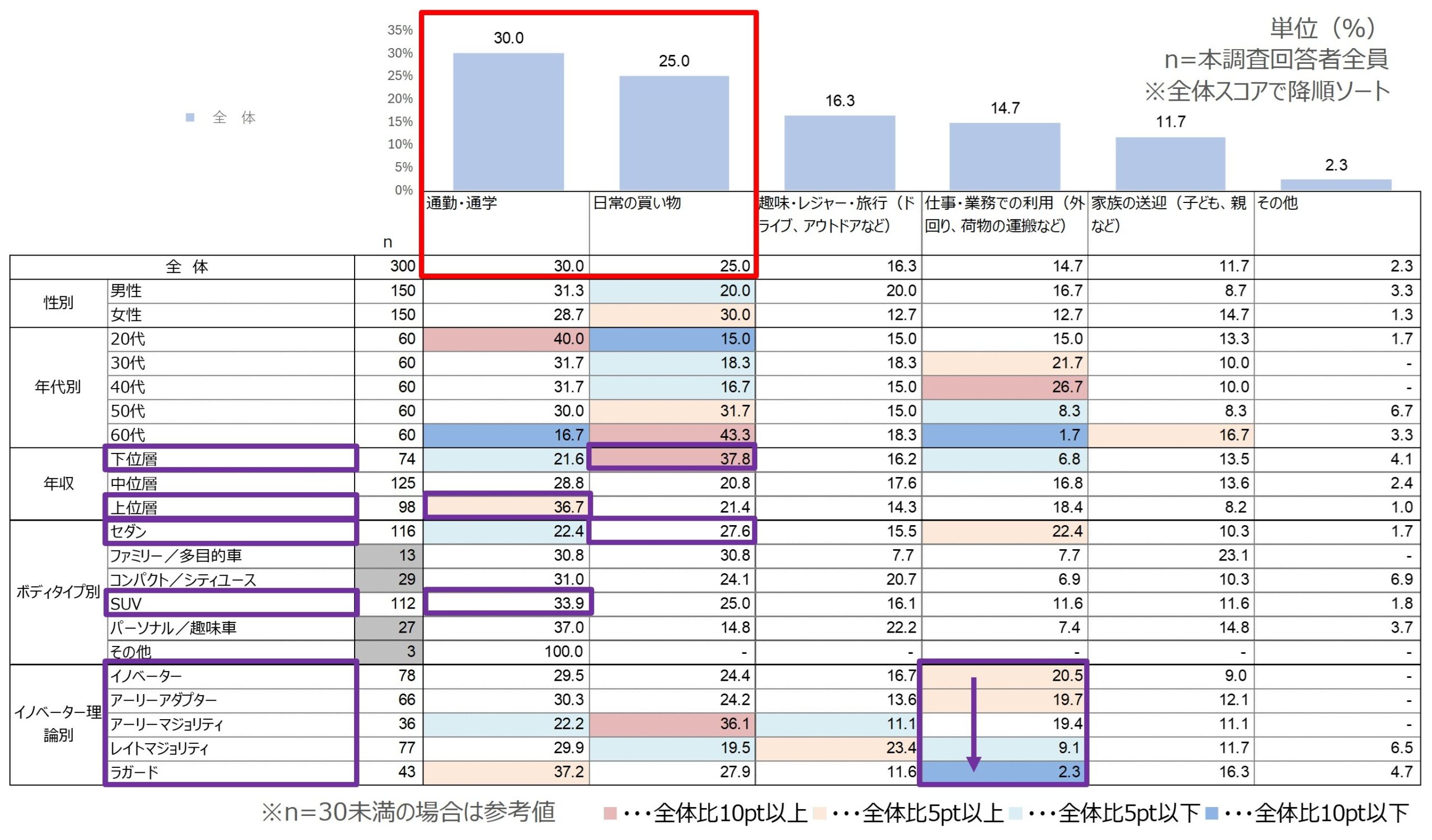 - 車の最多利用目的に絞ると「通勤・通学」がトップ。「日常の買い物」は2位へ後退