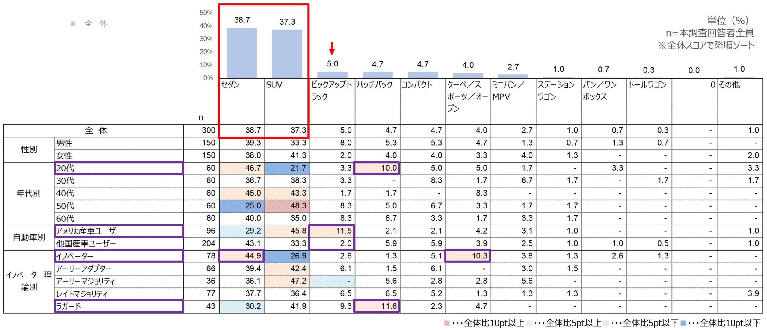 「セダン」「SUV」が共に4割弱を占め、この2タイプで市場の大半を構成している。「ピックアップトラック」は全体では5%にとどまる結果となった。