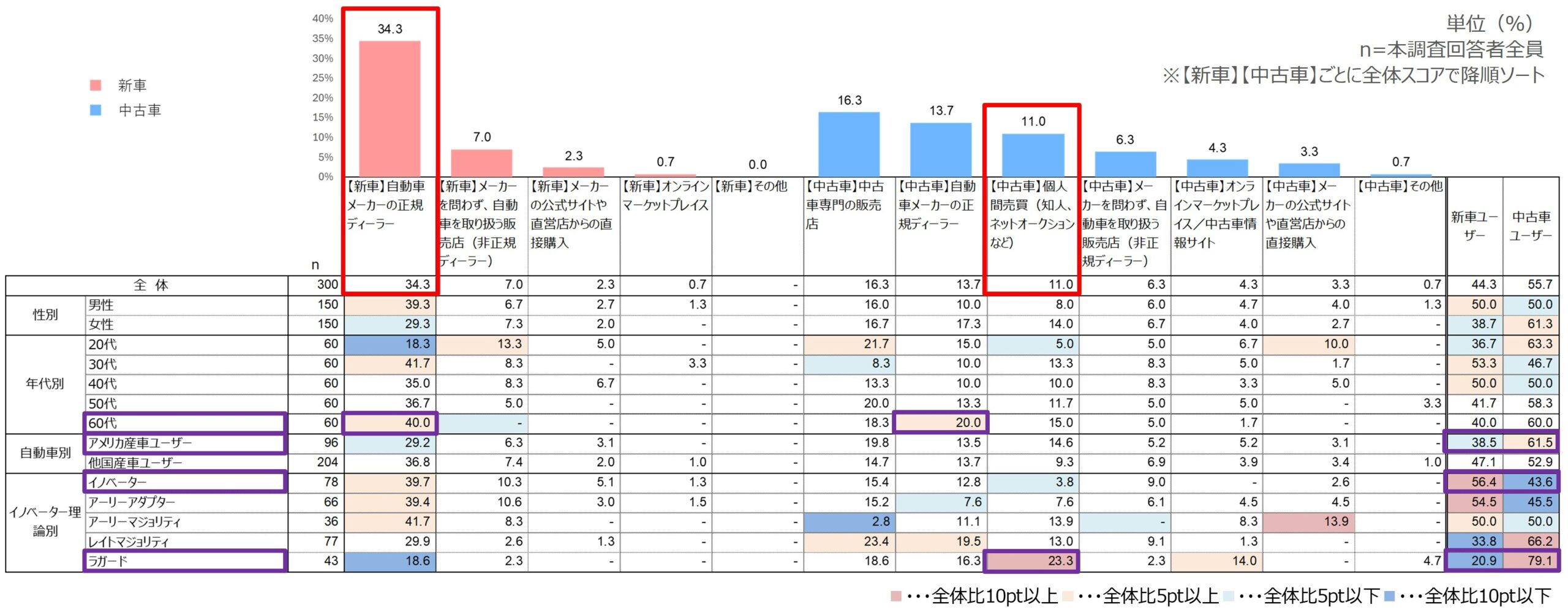 新車購入は「正規ディーラー」が圧倒的だが、中古車購入では「中古車専門販売店」を筆頭に、「正規ディーラー」や「個人間売買」などチャネルが分散している。特に「個人間売買」が約1割と一定のシェアを持つ点は特徴的である。