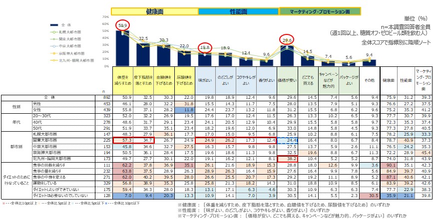 糖質オフ・ゼロビールを飲み始めたきかっけは、健康面は『体重を減らす』、性能面は『味が良い』、マーケティング・プロモーション面は『価格が安い』がそれぞれトップ。都市別でみると、関東は健康面、性能面で他都市と比べ高い項目が多いが、価格は重要視されていないのか、やや低め。一方で、北九州・福岡は『価格が安い』が高く、『体重を減らす』きっかけの次に高い。