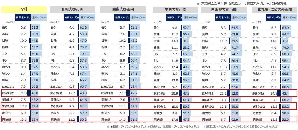糖質オフ・ゼロは、いずれの都市も他の項目と比べて『飲みやすさ』が高く、加えて『まろやかさ』『爽快感』も概ねの都市で良好。