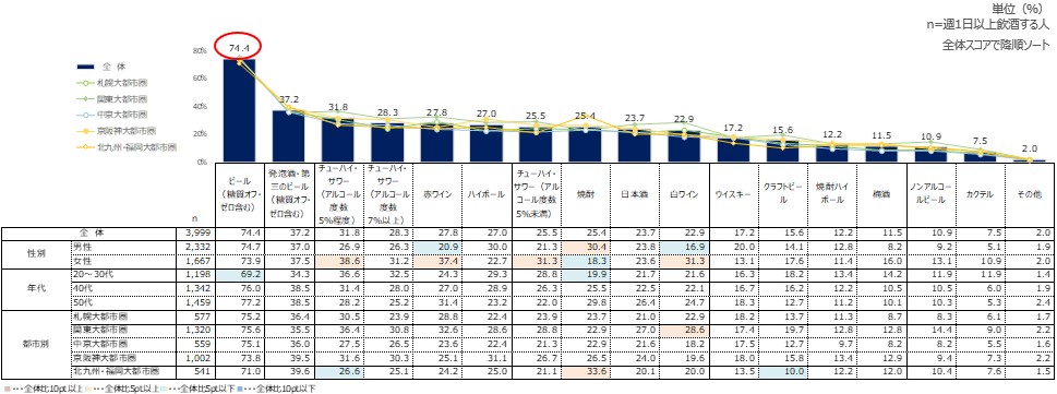 男性は焼酎、女性はチューハイ・サワーとワインが高い。