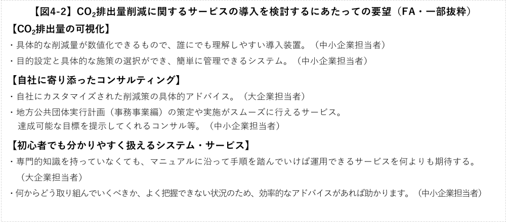 「CO2排出量削減サービスへの要望」を自由回答で募った設問では、CO2排出量の可視化を希望する意見が散見されました。加えて自社にとって適切な目標設定や施策をアドバイスしてくれるコンサルティングへの需要や、初心者でも分かりやすく扱えるシステム・サービスを求める声が上がりました。