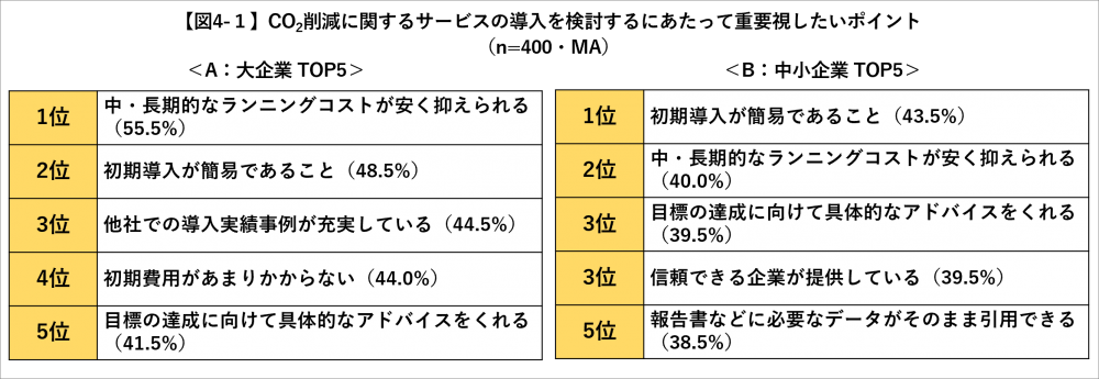 CO2排出量削減に関するサービスにおいて、「ランニングコストが安く抑えられ、初期導入が簡易にできること」が企業規模を問わず担当者から求められているポイントであることがわかりました。