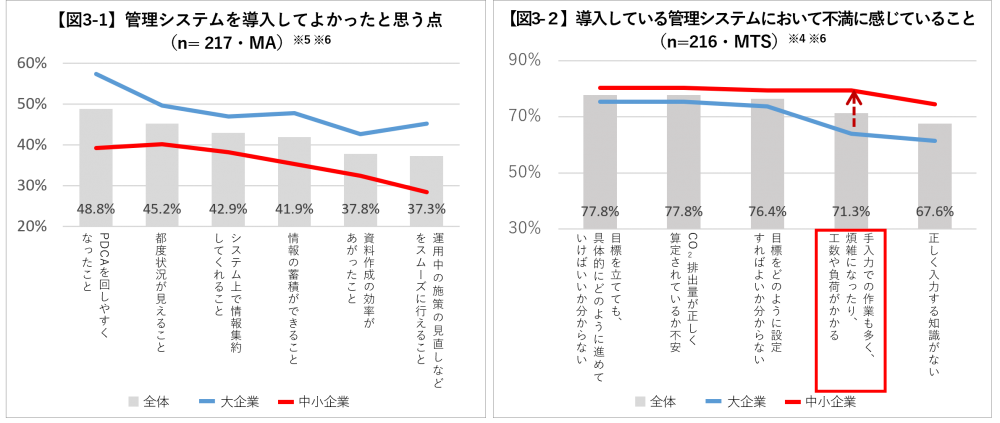 CO2排出量把握・削減は「管理システムの導入」により取り組んでいる企業が多数。一方で目標設定の難しさや手入力での作業による工数や負荷の増大といった課題も