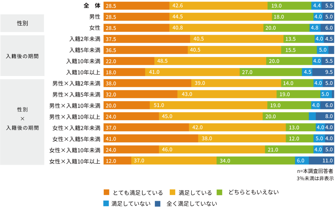 入籍から経過年数が長くなるにつれて、「とても満足している」の割合は下がり、「どちらともいえない」の回答が増えてくる。