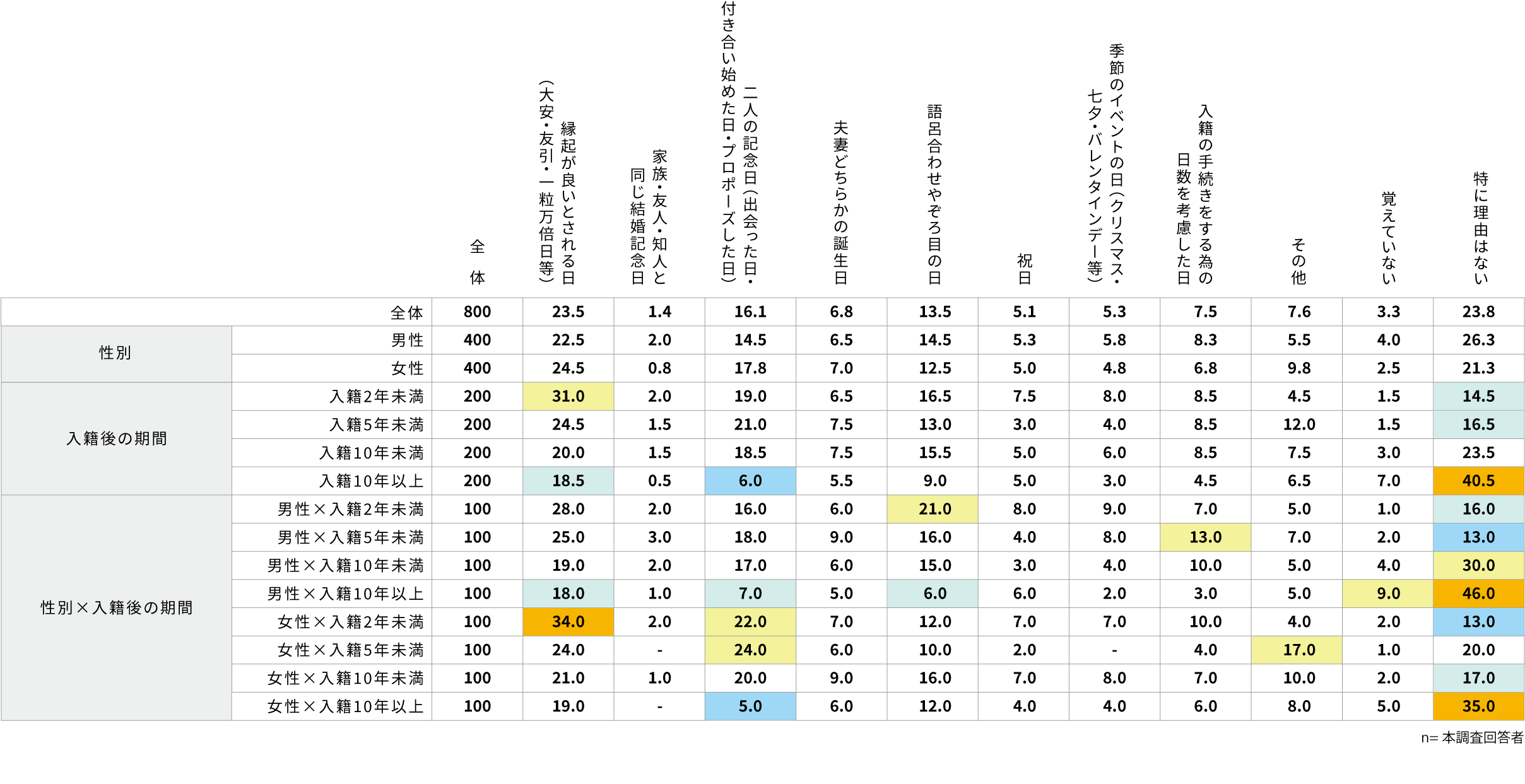 入籍10年以上の層で、「特に理由はない」が4割以上と他の層より高い一方で、「二人の記念日」が最も低くなる。入籍2年未満の女性では、「縁起が良いとされる日」が他の層より高く、「特に理由はない」が最も低くなる。