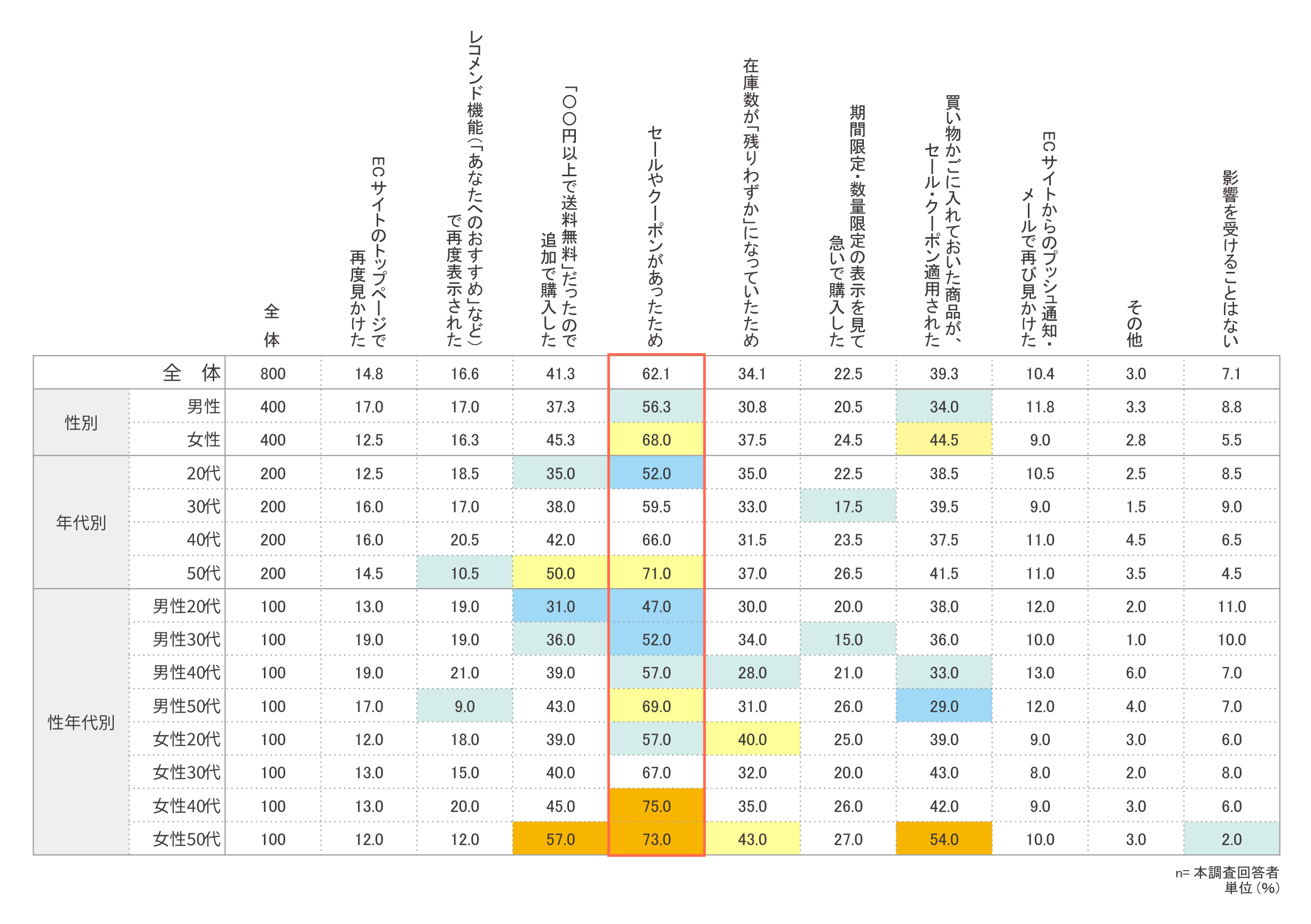 全体の6割以上の人が「セールやクーポンがあったため」と回答。さらに性年代別でみると、年代と比例して高まっており、特に女性40代、50代が突出している。比べて20代の数値は低く、特に男性20代は唯一、5割を下回る結果となった。