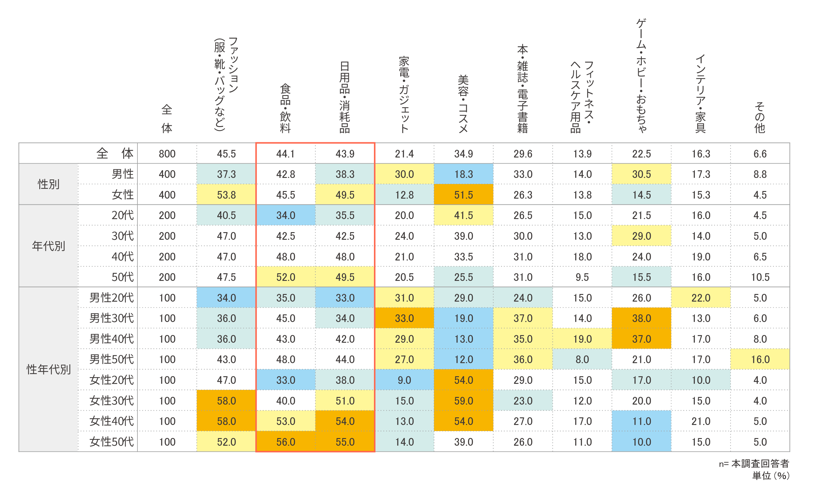 性年代別でみると、「食品・飲料」「日用品・消耗品」は年代と比例して数値が高まる傾向があり、「食品・飲料」では女性20代と50代とで最大23ptの差があった。「家電・ガジェット」は男女差が表れており、全年代において男性が女性の約2倍の数値となった。また、「ゲーム・ホビー・おもちゃ」では男性30代、40代に極めて高い数値が見られた。