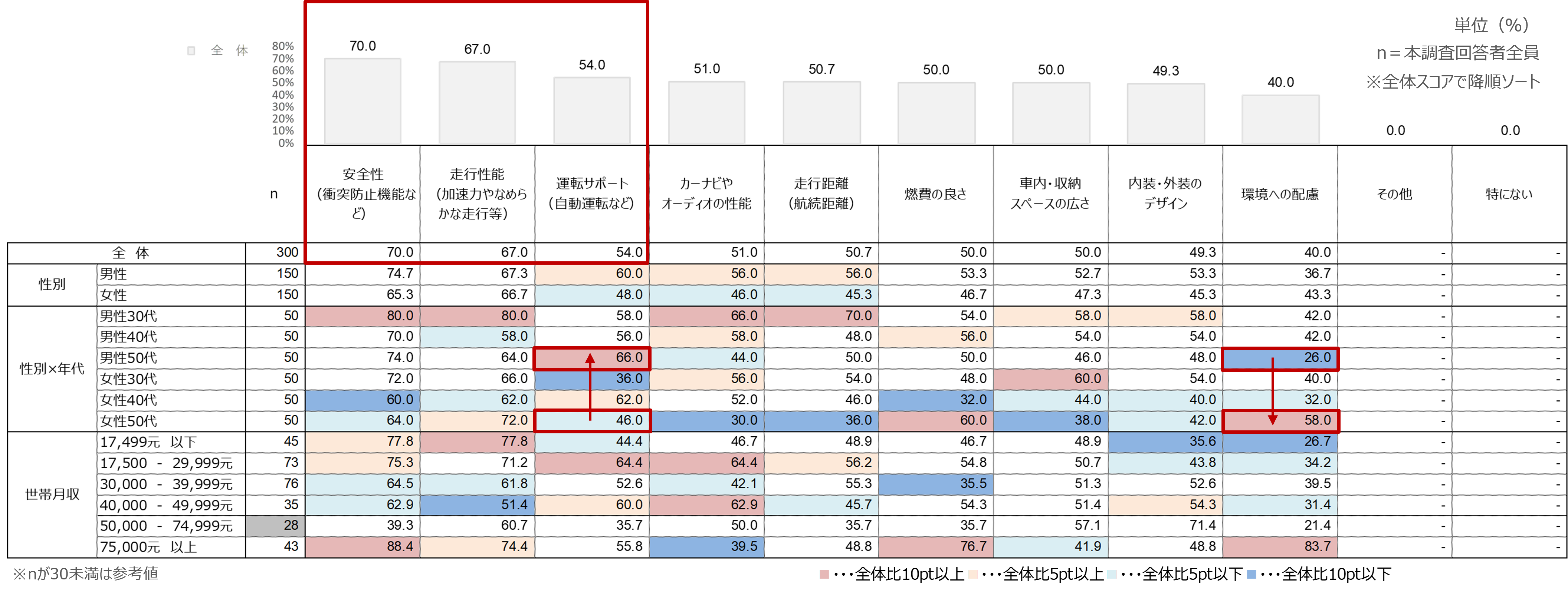 『男性50代』と『女性50代』を比較すると、「運転サポート」は男性の方が20ポイント高く、「環境への配慮」は女性の方が約30ポイント高い。