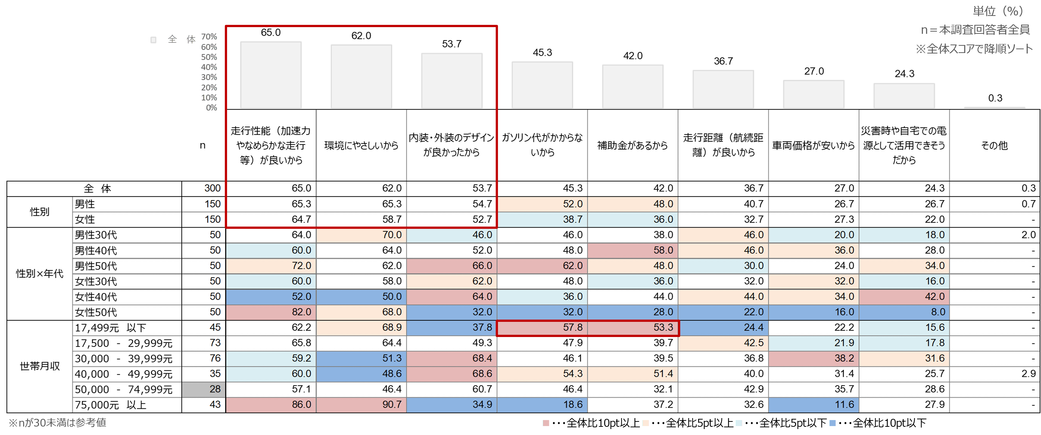 EV車両を購入しようと思った理由は「走行性能が良いから」「環境にやさしいから」「内装・外装のデザインが良かったから」が上位に挙がる。