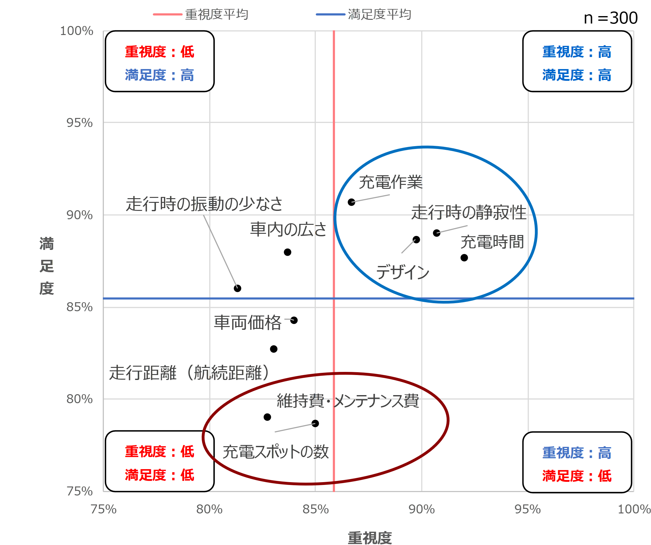 重視度、満足度共にいずれの項目も高い水準であり、各項目を以下の図にプロットすると重視度が高く、満足度が高い象限では「充電作業」「デザイン」「走行時の静寂性」「充電時間」が位置している。