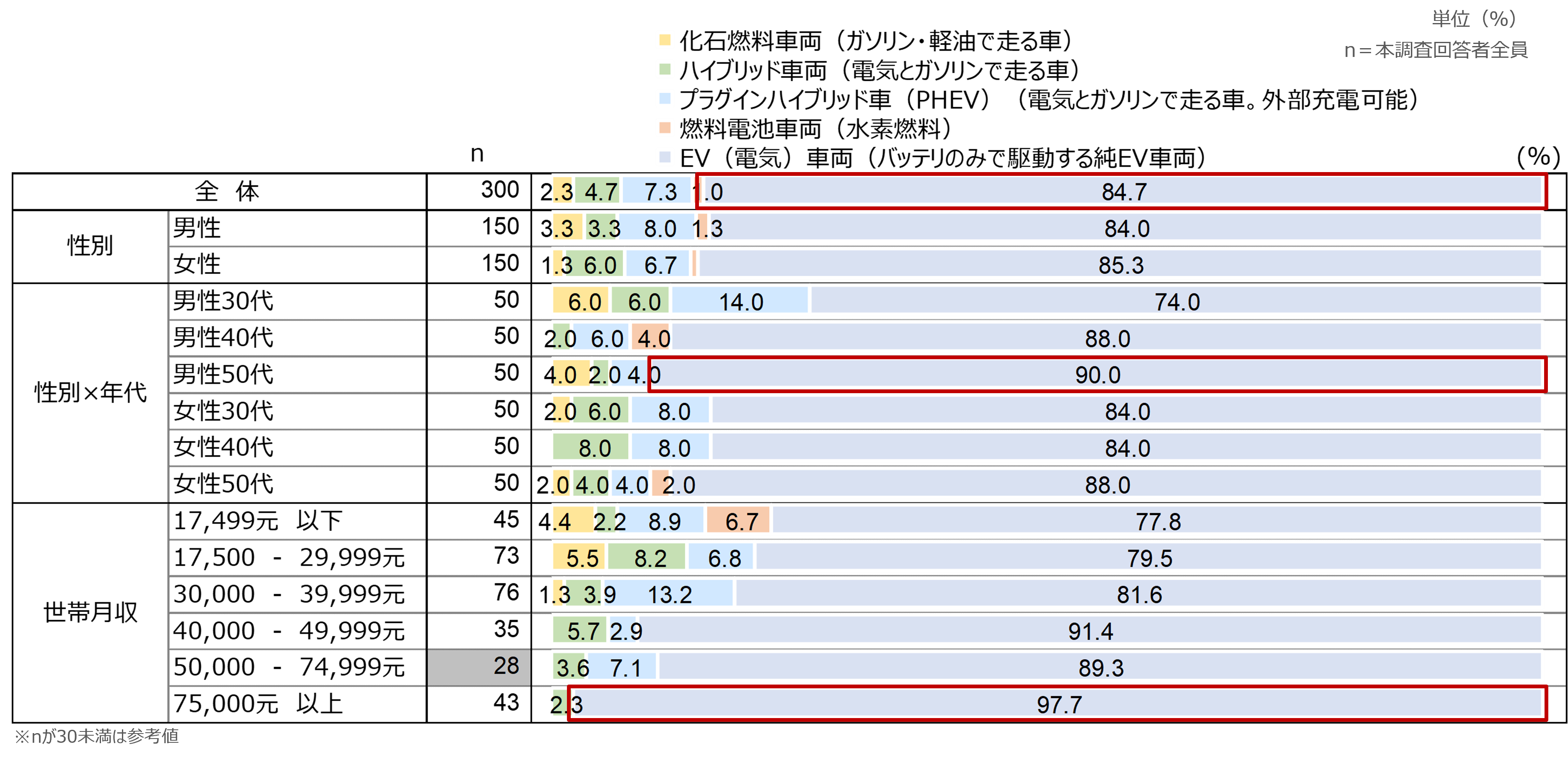 世帯月収別では『17,499元以下』は「ガソリン代がかからないから」「補助金があるから」が全体と比べて高く、費用を重視していることが分かる。