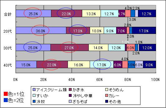 | 20代 | 1位「アイスクリーム(36.0%)」 | 2位「かき氷(17.0%)」 |