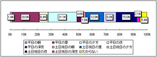 平日の夜が21,2%で最も高く、次いで、平日の昼の20%、土日祝日の15%と続いている。
