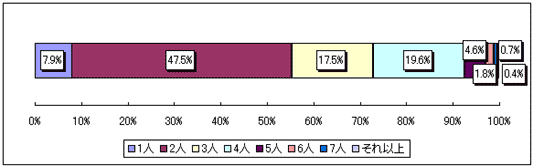2人が47,5%で最も高く、半数弱を占めている。次いで4人の19,6%と続いている。