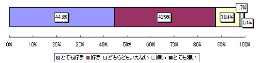 牛肉料理の好意度をたずねたところ、44,6%が「とても好き」という回答となっており、「とても好き」と「好き」を合算してにみると、全体の87,5%の人が牛肉料理が好きという回答になった。