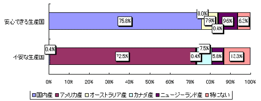 最も不安な生産国は、「アメリカ産」で72,5%と圧倒的多数を占める結果となった。