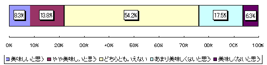 アメリカ産の牛肉の味に対する評価をたずねたところ、合算で美味しい寄りの評価が22,1%、一方美味しくない寄りの評価が23,8%で、若干美味しくない寄りの評価が高い結果となった。全体から見ると意見が分かれるところとなった。