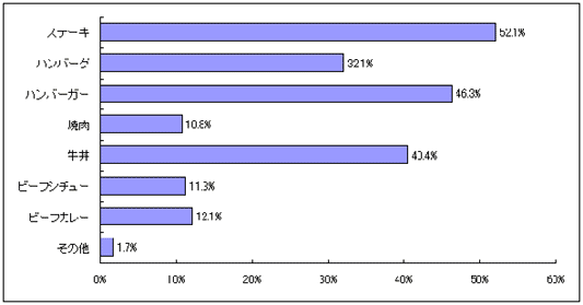 アメリカ産の牛肉のイメージ合う料理をたずねたところ、「ステーキ」が52,1%で最も高く、次いで「ハンバーガー」の46,3%、「牛丼」の40,4%と続いている。TOP3は、40%以上の結果となった。
