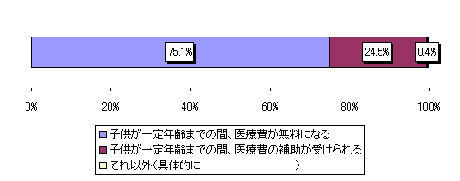 乳幼児の医療費助成制度の助成内容は、各自治体によって異なっているが、医療費助成制度利用によっての負担状況をきいたところ、「子供が一定年齢まで無 料」が全体の75.1%で最も高く、「子供が一定年齢まで補助」が24.5%という構成であった。また、それ以外は、「無料であるが、所得制限がある」と いう回答内容であり、多くは、子供が一定年齢に達するまで、医療費が控除される自治体が多いことがわかる。