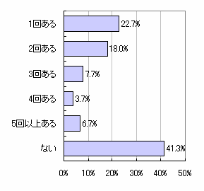 転職経験の有無・ある場合は回数を聞いたところ、「ない」が40%強を占め、「ある」場合は、「2回以下」が40%強を閉める構成となっている。