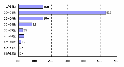 初めてクレジットカードを作った年齢を尋ねたところ、「20~24歳」が53.3%で最も多く、半数以上を占めている。29歳までにクレジットカードを作った割合は、80%強に上る。また、初めてクレジットカードを作成した年齢の平均は、23.8歳で、丸井カードやセゾンカードなどが比較的多かった。