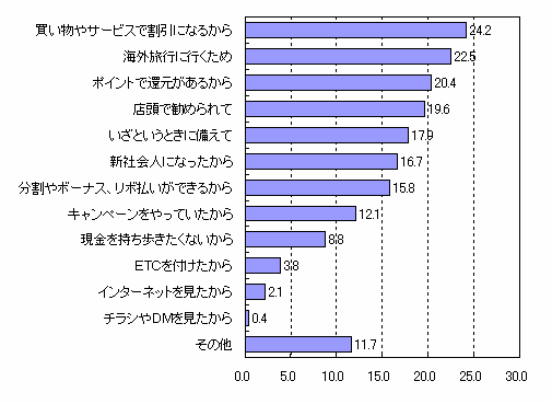初めてクレジットカードを作ったきっかけを尋ねたところ、「買い物やサービスで割引になるから」の24.2%が最も多く、次いで「海外旅行に行くため」の22.5%、「ポイントで還元があるから」の20.4%がTOP3となっている。