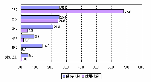 次に、そのうち使用している枚数を尋ねたところ、「1枚」が多数を占め、67.9%、次いで「2枚」の24.6%と続いている。また、平均使用枚数は、1.45枚であった。