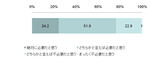 家にある固定電話の必要性を4段階の評価設問で尋ねたところ、「絶対に必要」が24.2%、「どちらかといえば必要」が51.9%、「どちらかといえば不必要」が22.9%、「まったく不必要」が1.0%という結果であった。必要である寄りの回答は、およそ8弱割、不必要である寄りの回答は、およそ2割強となっている。