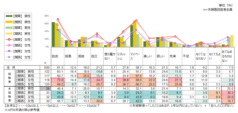 経験者女性は、自由・マイペース・リフレッシュ・自立・充実・楽しいなどのポジティブなイメージを持っており、特に関東女性でその傾向が顕著にみられる。また、関西の男性は孤独に感じる人が多いことから、寂しがりが多いと推察される。